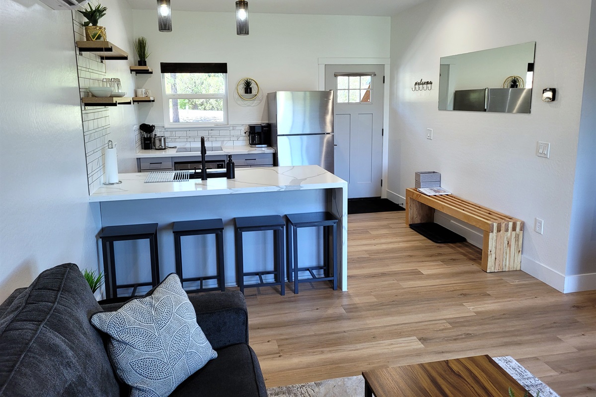 1 Bedroom • 1 Bathroom 1 Bath • Sleeps 2-4Experience luxury in the pines! Take in the breathtaking view overlooking the Meadow while staying close to town. Our modern cabin villa is ideal for a family looking for a peaceful trip to the mountains. King size memory foam bed, Queen size (sofa bed), large bathroom with a wet room and rain shower, and a full size kitchen. Tons to do within walking distance including hiking, disc golf and fishing! Popular restaurants are just around the corner or order in and watch your choice of entertainment on two smart TV's.